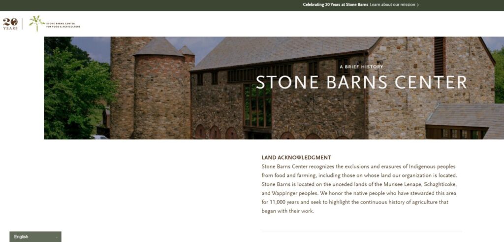 Stone Barns Center recognizes the exclusions and erasures of Indigenous peoples from food and farming, including those on whose land our organization is located. Stone Barns is located on the unceded lands of the Munsee Lenape, Schaghticoke, and Wappinger peoples. We honor the native people who have stewarded this area for 11,000 years and seek to highlight the continuous history of agriculture that began with their work.